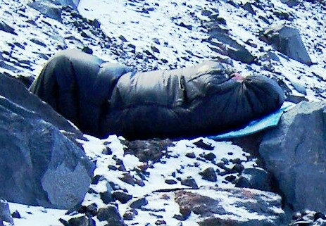 John McIntosh in his sleeping bag at the emergency camp. By Matthew Kneisler.