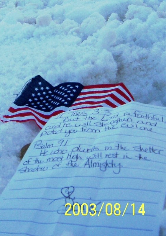 Small flag and scriptures Matthew displayes at the high point of our climb. By Matthew Kneisler.