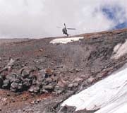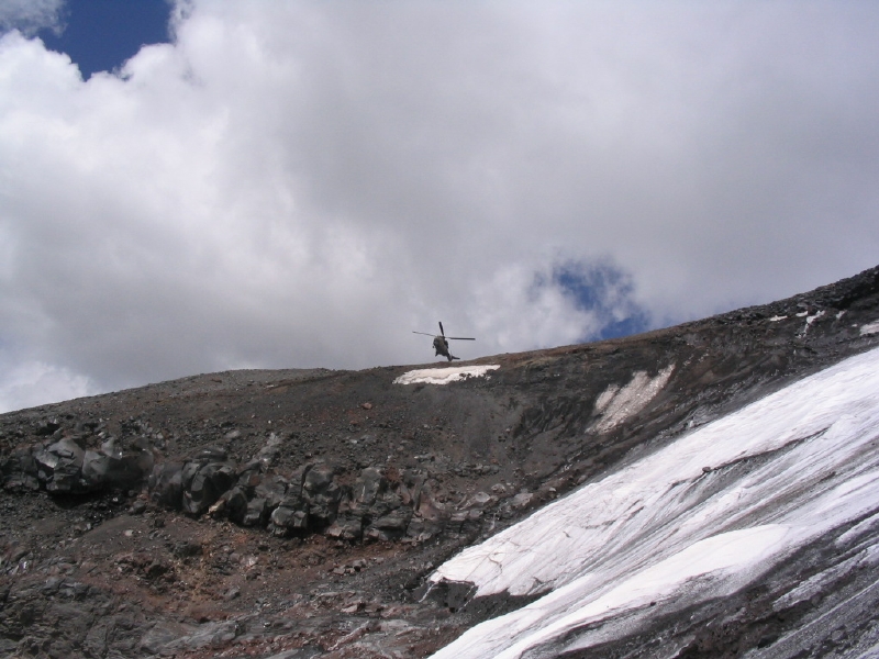 The Turkish Blackhawk helicopter flies west of our rescue camp at 13,800 feet a day after the accident. By Dow Pursley.