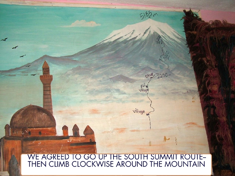 The standard south face summit route and our research route up Ararat. By John McIntosh.