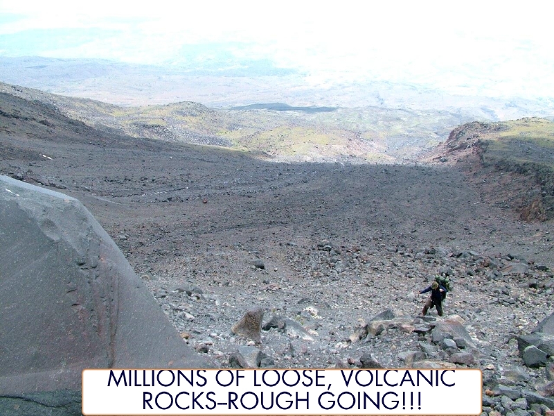 Dow crossing millions of loose volcanic rocks. By John McIntosh.