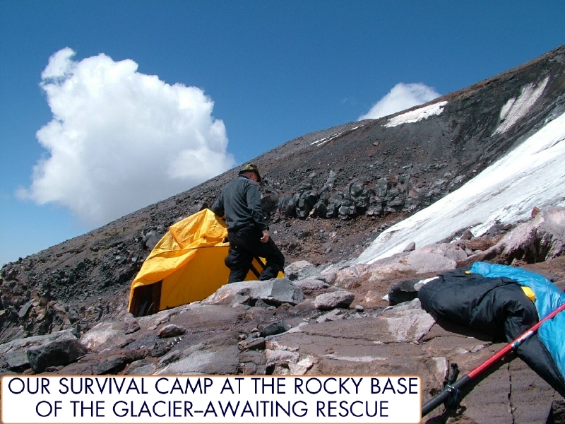 Our survival Camp at the bottom of the glacier and near a 200-300 foot cliff. By John McIntosh.