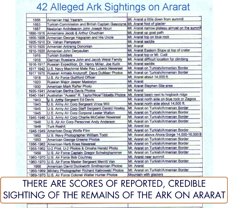 42 alleged sightings of the Ark on Ararat--from the Explorers book.