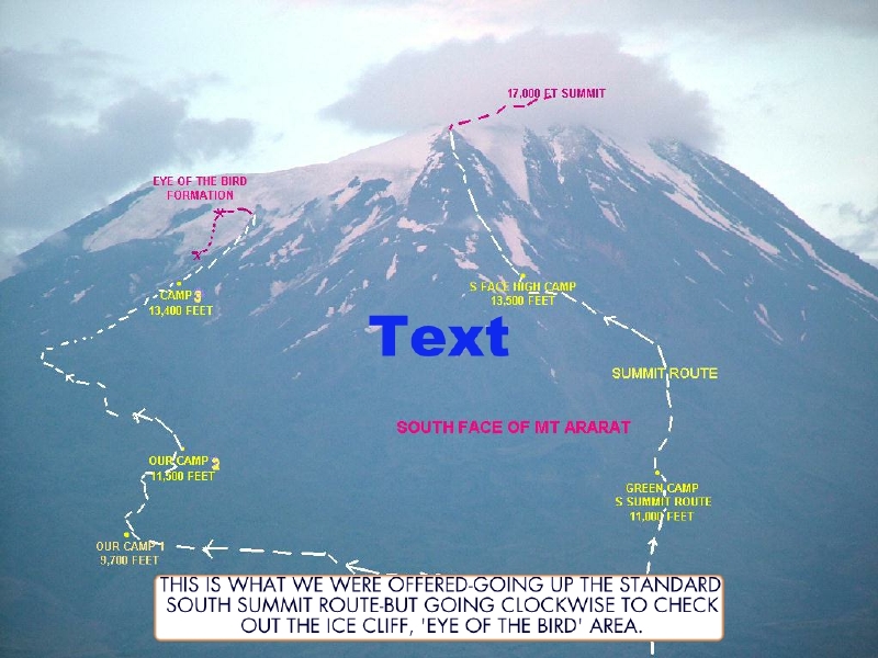 The standard south face summit route and our research route up Ararat. By John McIntosh.