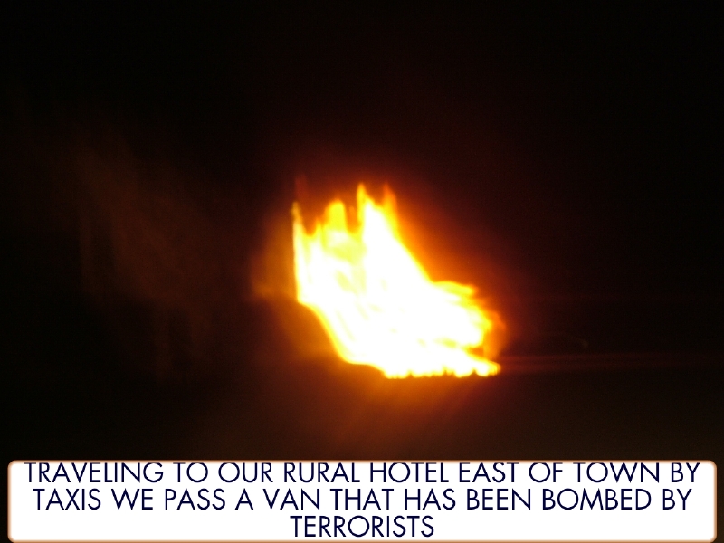Pre climb picture from our taxi on the way to Dogubayazit by Dow Pursley of a burning car. Reportedly destroyed by a terrorist bomb.