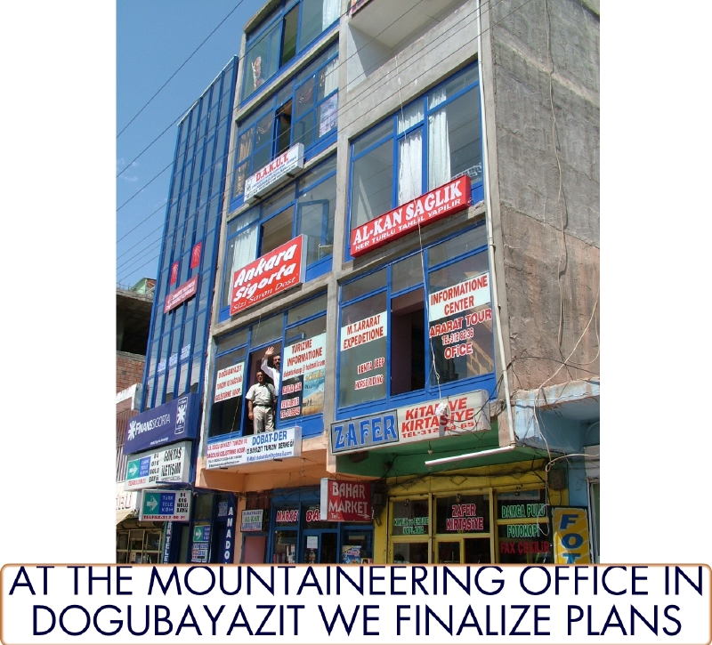 Mountaineering guides waving at us from their office in Dogubayazit. By John McIntosh.