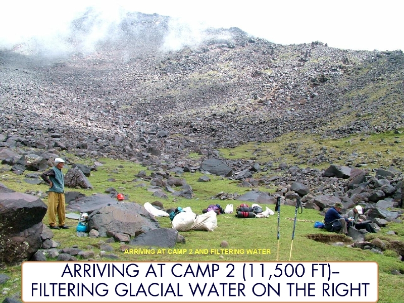Dow and Matthew filtering water at Camp 2 at11,500 feet.