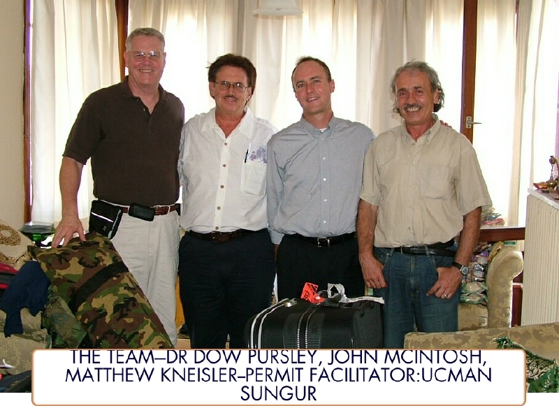 Pre climb picture in Istanbul. Visiting a Christian Cafe. Pictured: D Pursley, Uchman Sungur (permit facilitator), Matthew K, and Olcay Balitatli (former Ark Research team member). Uchman was the main expedition guide for the 1982 Irwin Ararat Expedition. He also helped obtain my 1983 Ararat expedition permit. By John McIntosh.