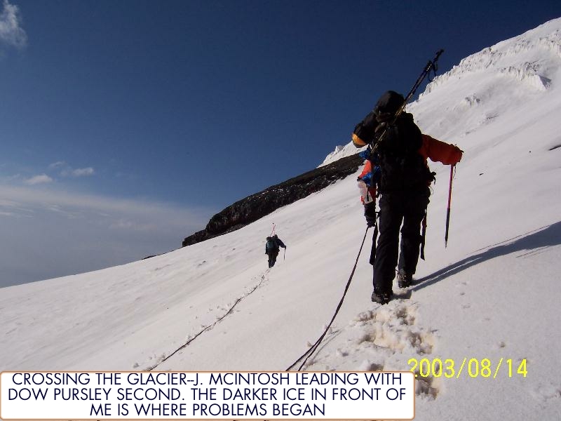 John McIntosh and Dow Pursley cross the glacier at 14,800 feet. Where the snow darkens in front of John-extremely rock hard ice is encountered and problems begin. Photo by Matthew Kneisler.