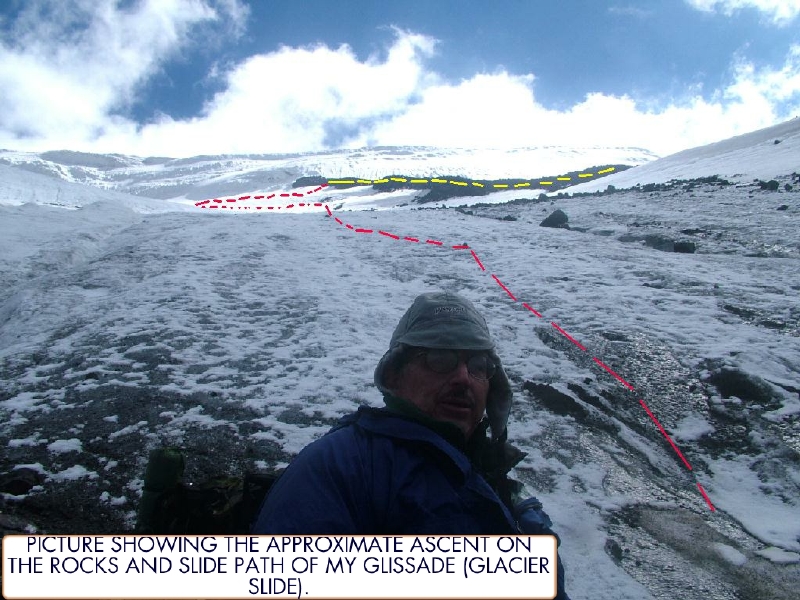 John McIntosh at the bottom of the glacier the next morning after doing an emergency 1000 foot glisade (slide) down the glacier the day before--breaking his right ankle--camping solo overnight. The dashed line show the approximate glacier and slide routes. By Dow Pursley